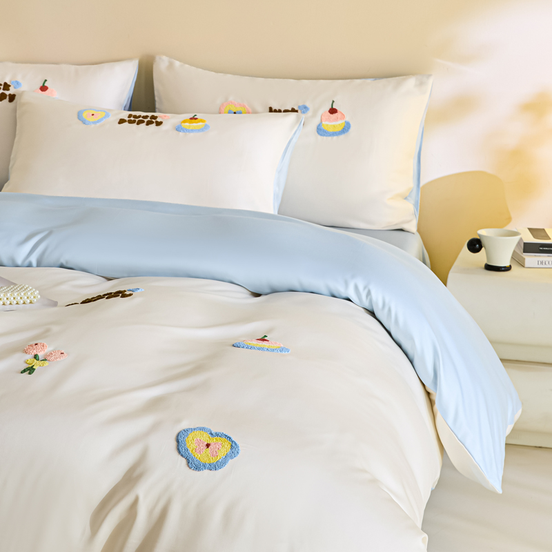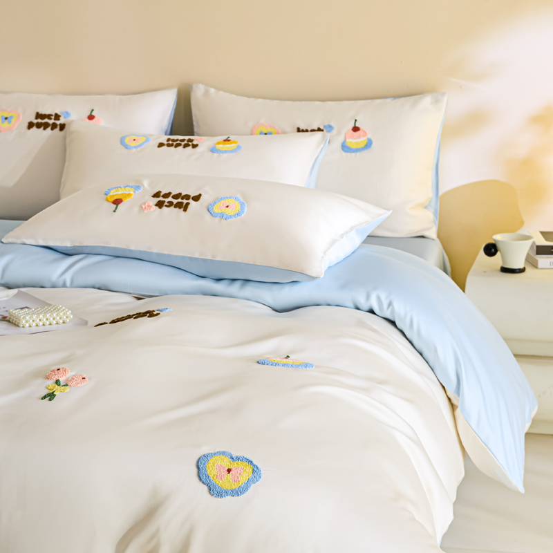 套件组成 有三件套、四件套。四件套分(床单式、床笠式)